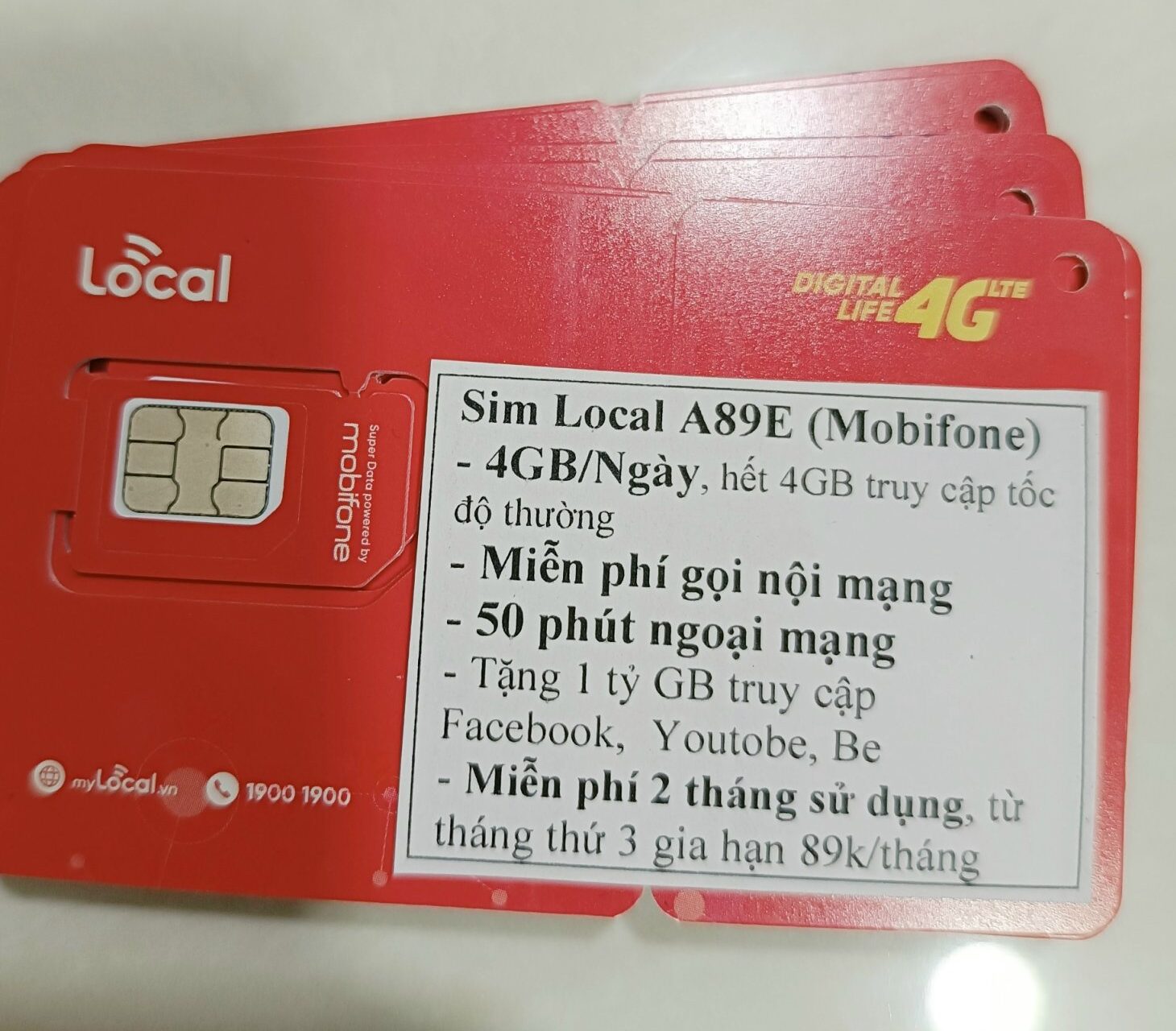 Sim 4G Local A89S 4GB/ngày mang đến cho người dùng những ưu đãi data đặc biệt với giá sim rất rẻ. Trong tháng đầu tiên khi sở hữu sim, người dùng sẽ có ngay 4GB sử dụng miễn phí mỗi ngày.